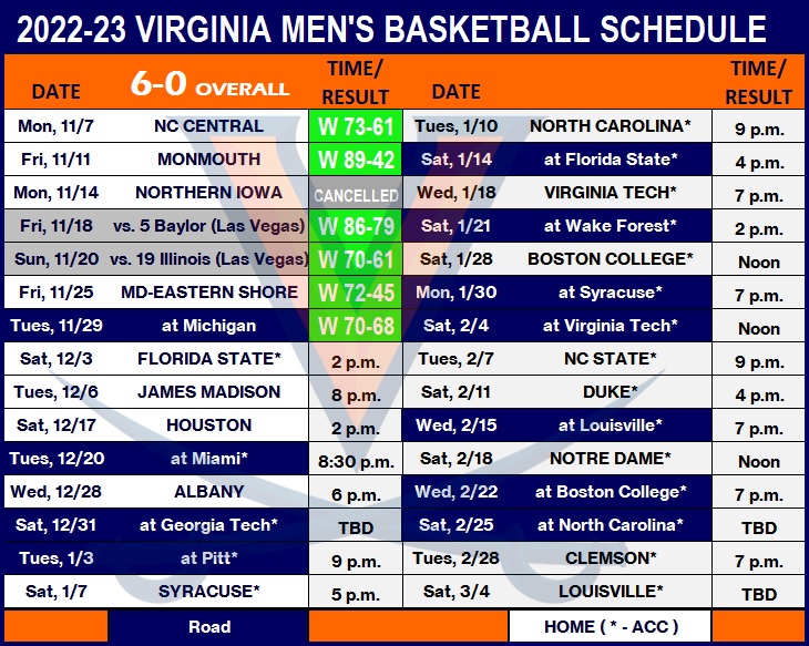 UVA will be shooting for its first 7-0 start since the championship season of 2018-19, and is fresh off a come-from-behind road win at Michigan, 70-68, in the final ACC-Big Ten Challenge this past Tuesday.