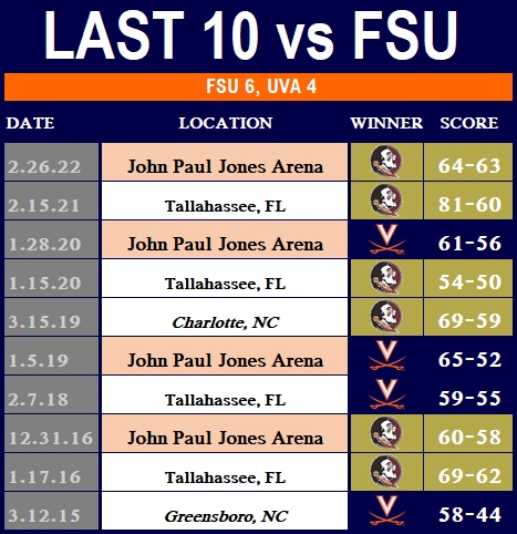 The Seminoles, who lead the all-time series, 28-26, have taken six of the last 10 meetings with the Cavaliers, including two of the last four in Charlottesville, and will be hungry to jumpstart ACC play with a bang.