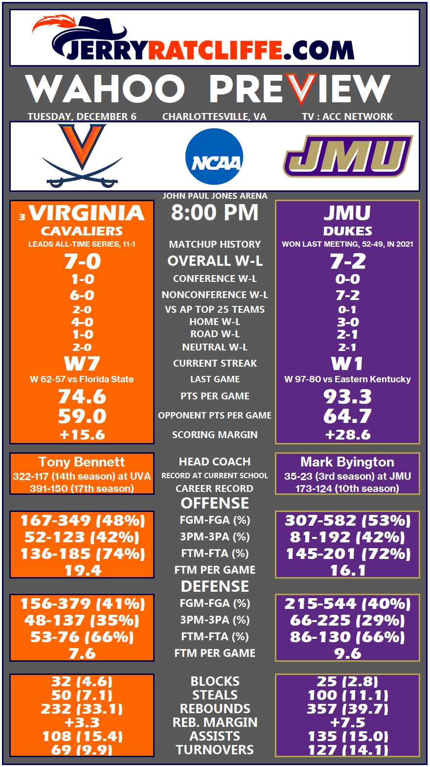 JMU enters tonight’s contest leading the nation in scoring at 93.3 points per game, while the Hoos are tied for 23rd among Division-I schools in points allowed at 59.0 per game.