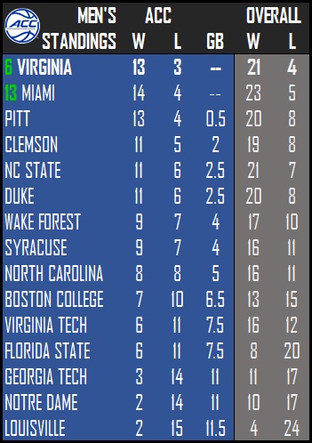 The Cavaliers (21-4, 13-3 ACC) will also need a win to stay atop the ACC standings, as Miami (14-4) and Pitt (13-4) are right on their heels with just a few games left in the regular season.