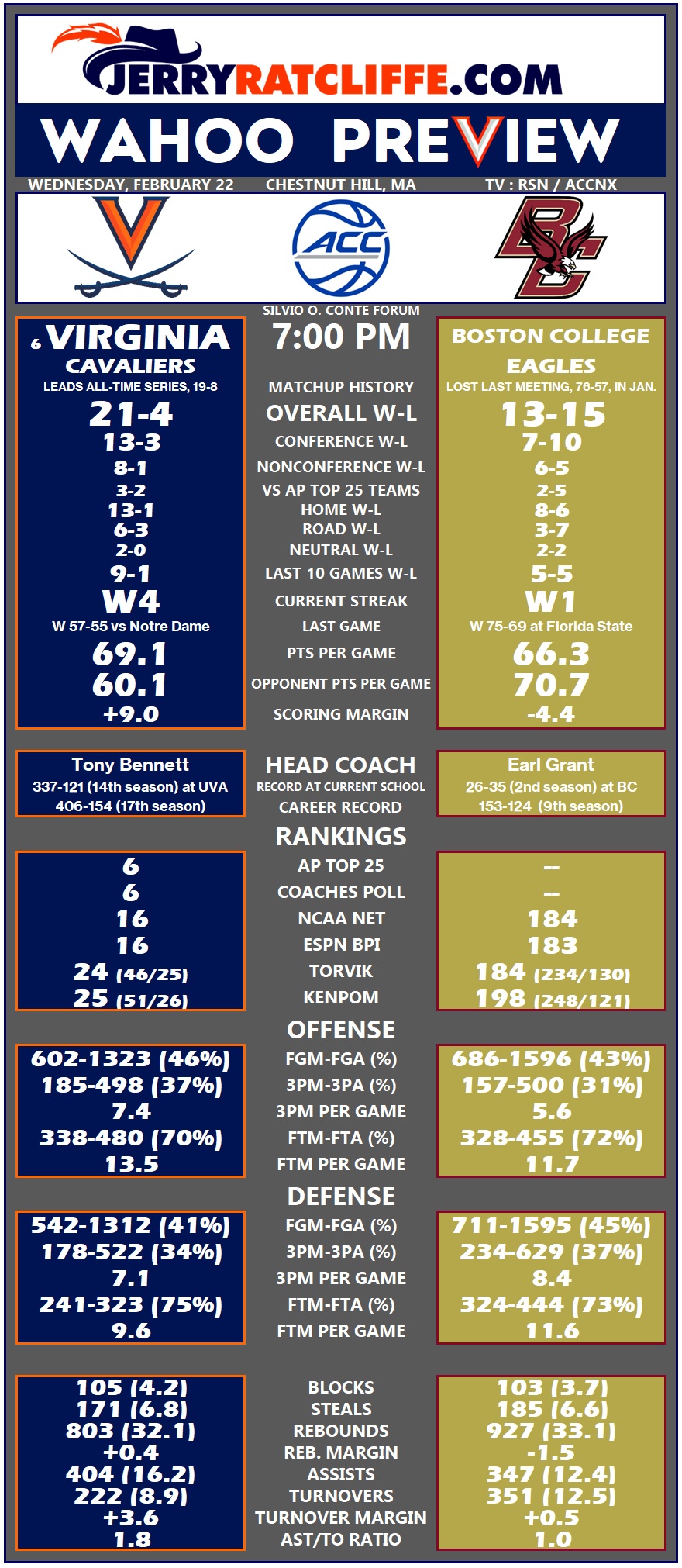 No. 6 Virginia looks for a season sweep against Boston College Wednesday night in Chestnut Hill, with tip off set for 7 p.m. (RSN/ACCNX).