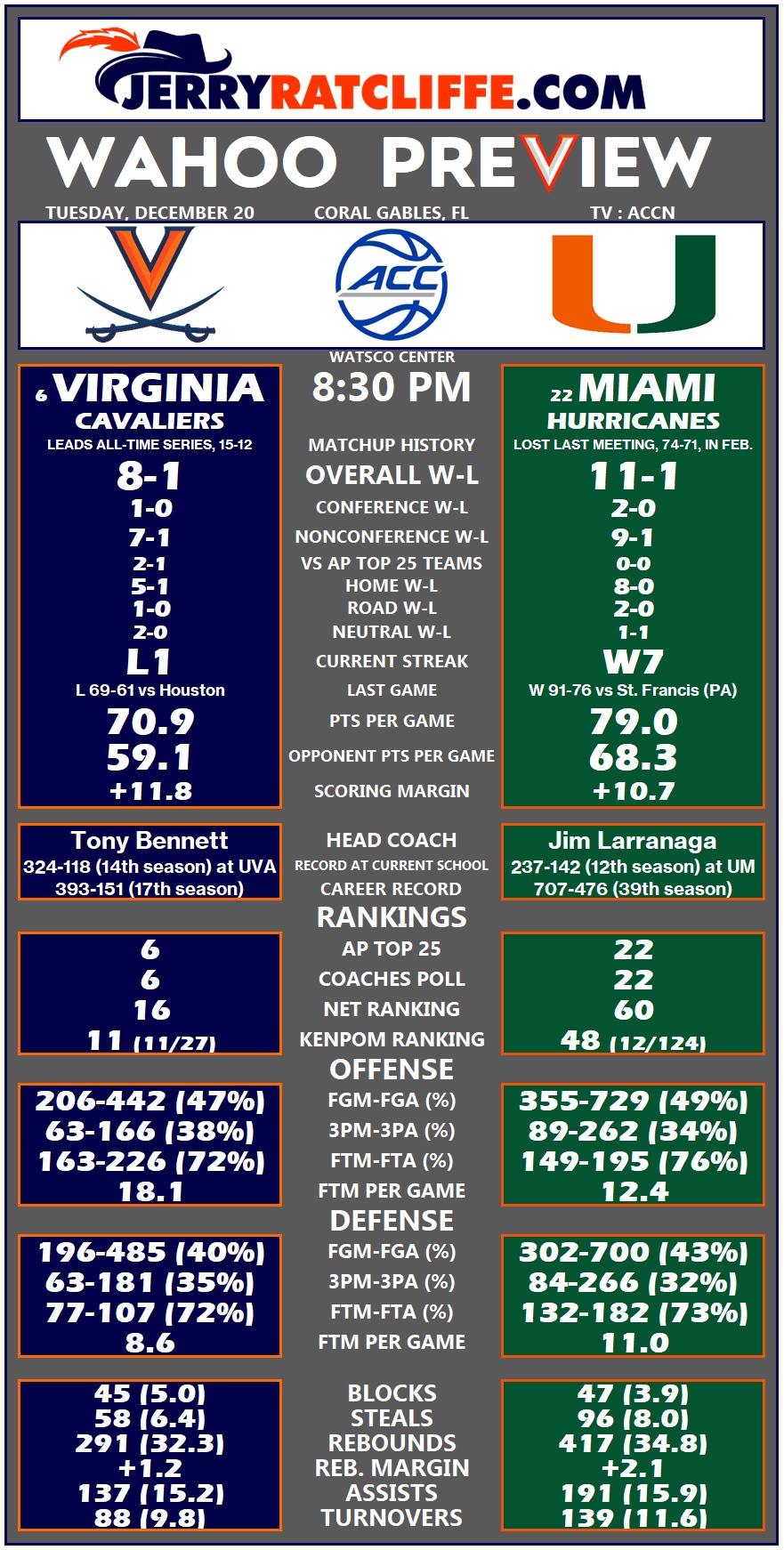 UVA (8-1, 1-0 ACC) came up short against Houston, 69-61, over the weekend, and will now face a talented Hurricanes squad on their home floor. Miami will be the fourth ranked opponent that the Wahoos have faced this season (2-1).