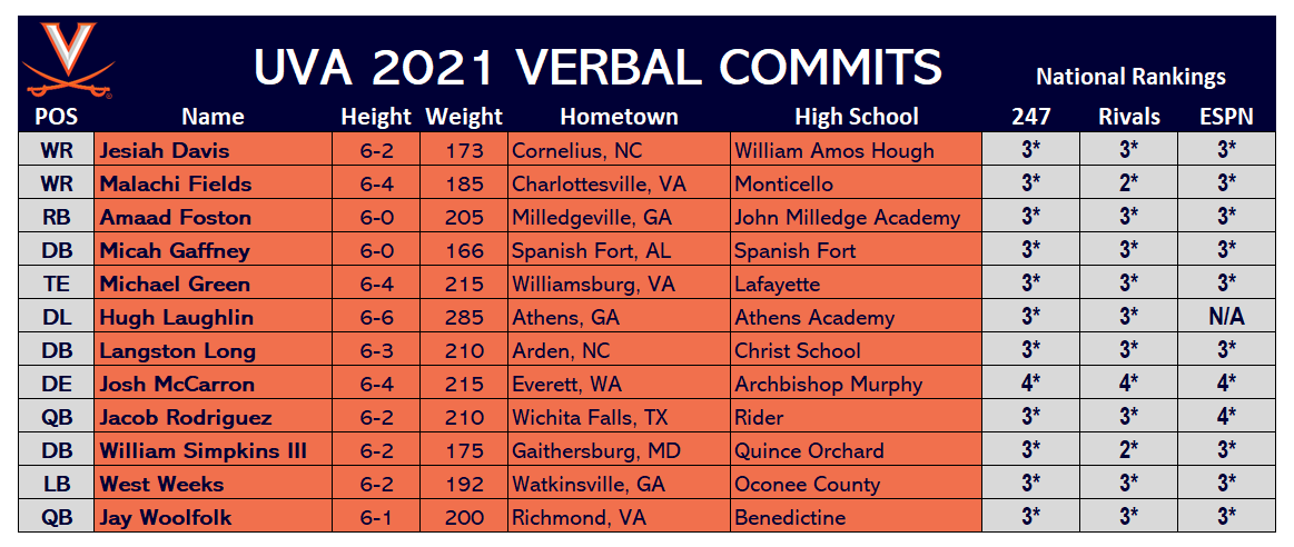 He picked Virginia over offers from Florida State, Tennessee, Central Florida, Louisville, Arizona State, Georgia Tech, Boston College, Ole Miss, Mississippi State, Syracuse, Air Force, Army, South Florida and others.
