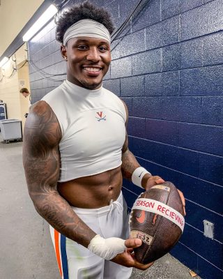 How about fighting for a 7-yard touchdown pass over Duke’s defender in the left corner of the end zone for a 23-10 lead, his ninth scoring catch of the season (tied for fifth-most in a UVA single season). Not only did he break Wahoo records, he placed himself either in or just on the outside of ACC top-10 performances for a single season with his night to remember.