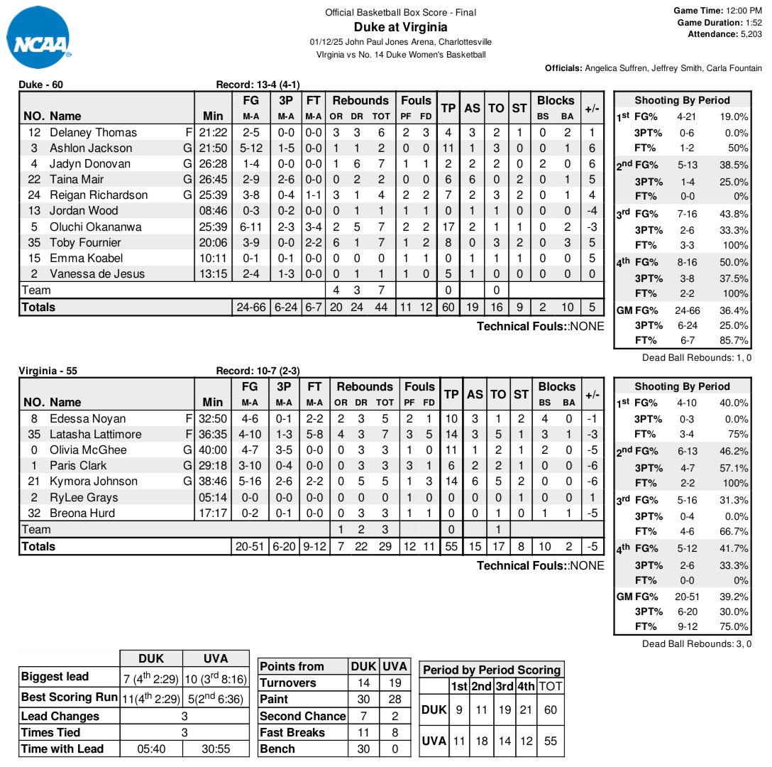 The Cavaliers forced the Blue Devils (13-4, 4-1) into nine consecutive missed attempts to start the game as UVA held Duke to just 4-of-21 shooting for the period taking an 11-9 lead into the second quarter.