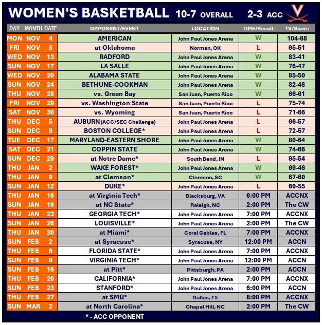 The Cavaliers return to action on Thursday when they travel to Virginia Tech. Tipoff at Cassell Coliseum is set for 6 p.m. on ACC Network Extra (ACCNX).