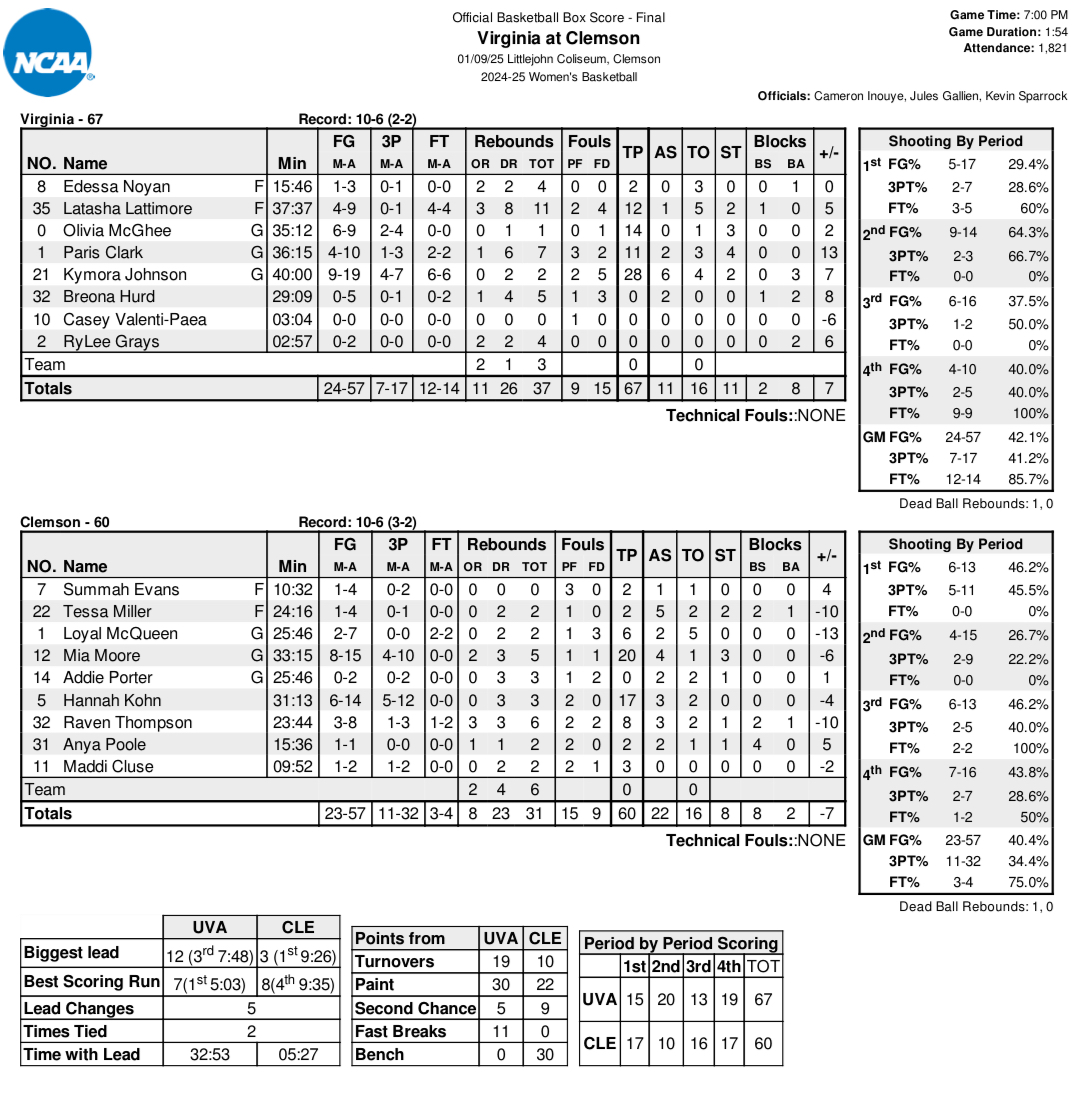 On the back of a season-high 28-point performance from Kymora Johnson, Virginia defeated Clemson, 67-60, on Thursday night at Littlejohn Coliseum. The win marks Virginia’s second consecutive conference victory and its first true road win of the season.