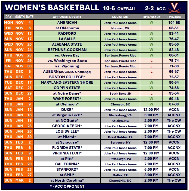In a back-and-forth opening quarter, the Cavaliers (10-6, 2-2 ACC) fell into an early 8-5 hole but responded with a 7-0 scoring run to take a 12-8 lead. The Tigers swayed momentum back in their favor using a 6-0 run of their own to take a two-point lead into the break [15-17].