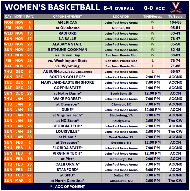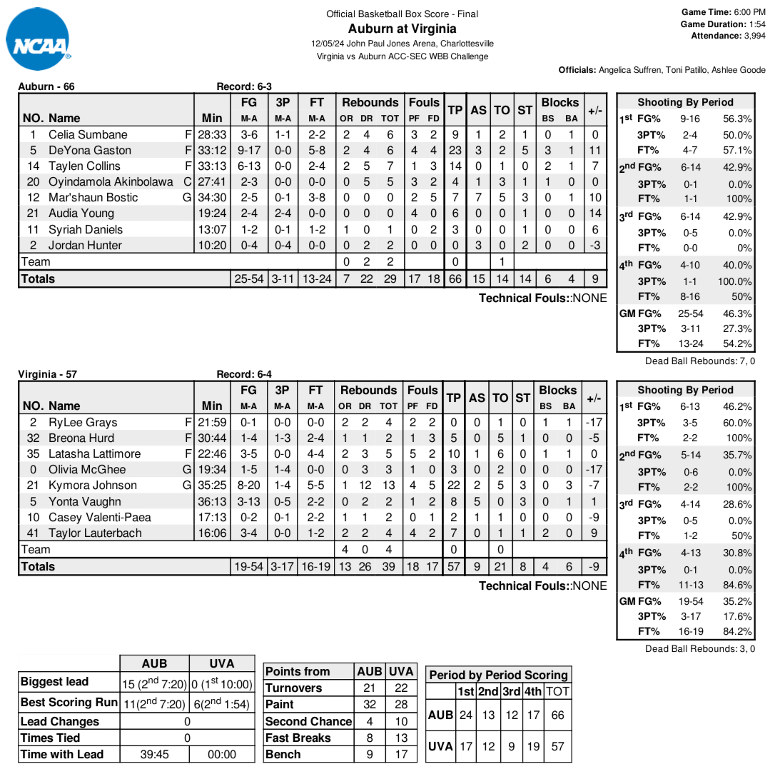 Virginia (6-4) fell behind early as Auburn mounted an 8-2 run to begin the game. The Cavaliers used a 7-3 run to cut the Auburn lead to just three [12-15], but the Tigers took a 24-17 advantage into the first-quarter break. Johnson and Vaughn combined for nine of Virginia’s 17 points in the first quarter.