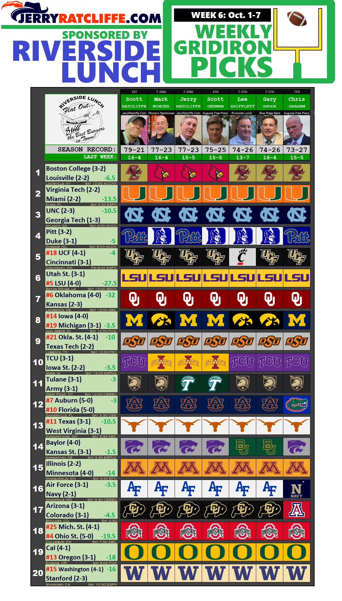 Weekly Gridiron Picks Sponsored By Riverside Lunch: Week 6