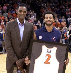 Sampson accompanied his nephew, Braxton Key, on the court for UVA’s pregame senior recognition ceremonies in March (Photo by John Markon).