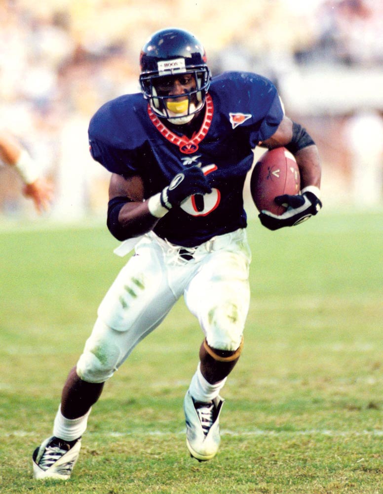 From the coal mines of Southwest Virginia to becoming UVA’s first consensus All-America offensive back since Bill Dudley in 1941, Jones worked hard en route to legendary status. The big power back finished eighth in the Heisman Trophy balloting in 1999, established ACC and UVA records with 1,798 rushing yards and 2,054 all-purpose yards as a senior, finishing third in the nation in rushing.