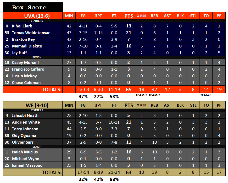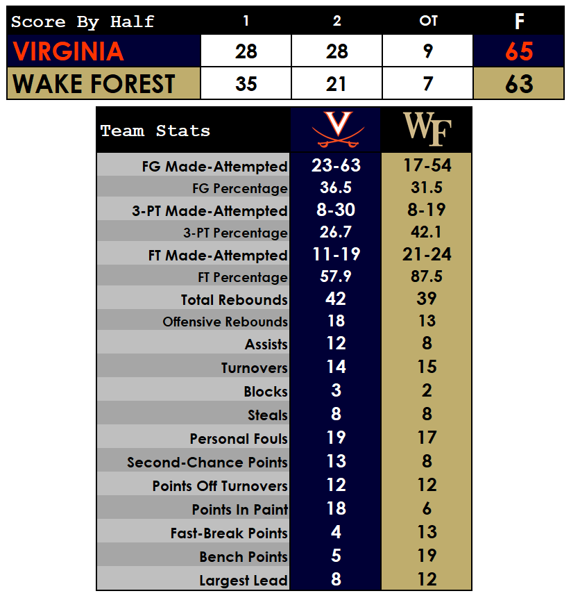 - UVA out-rebounded Wake Forest 42-39