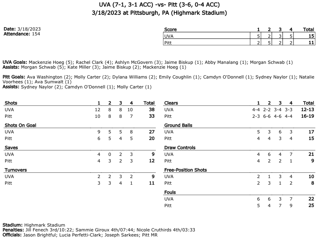 The No. 10 Virginia women’s lacrosse team picked up a 15-11 road victory at Pitt on Saturday at Highmark Stadium in Pittsburgh. After trailing by one midway through the third quarter, Virginia scored five straight goals to secure the road victory.
