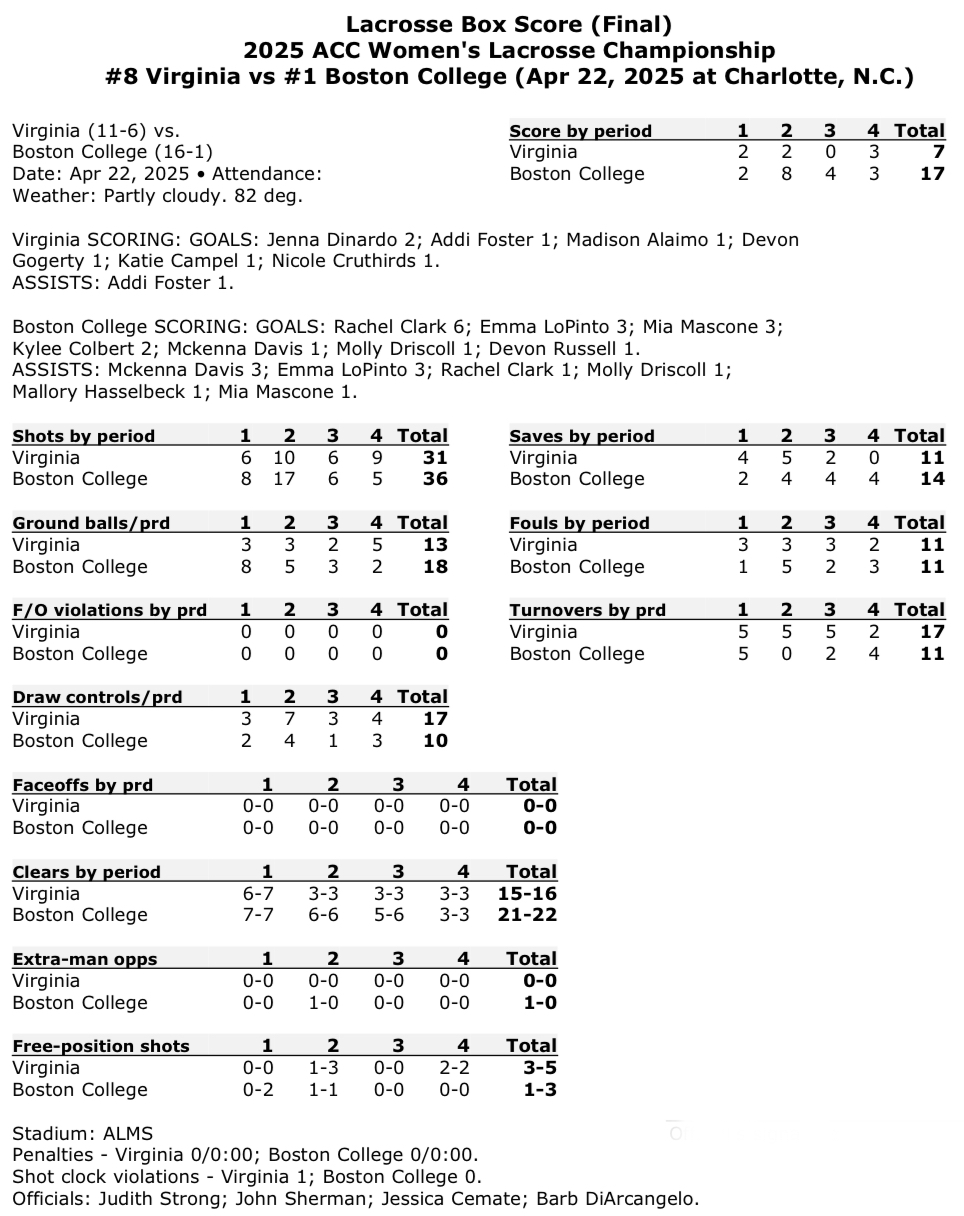 Virginia (11-6) took an early 2-1 lead on a goal from sophomore attacker Addi Foster five minutes into the contest, but BC answered with back-to-back goals to take a 3-2 lead. Junior defender Nicole Cruthirds went the length of the field to score her first career goal to tie the game 3-3 with 11:56 remaining in the second quarter.