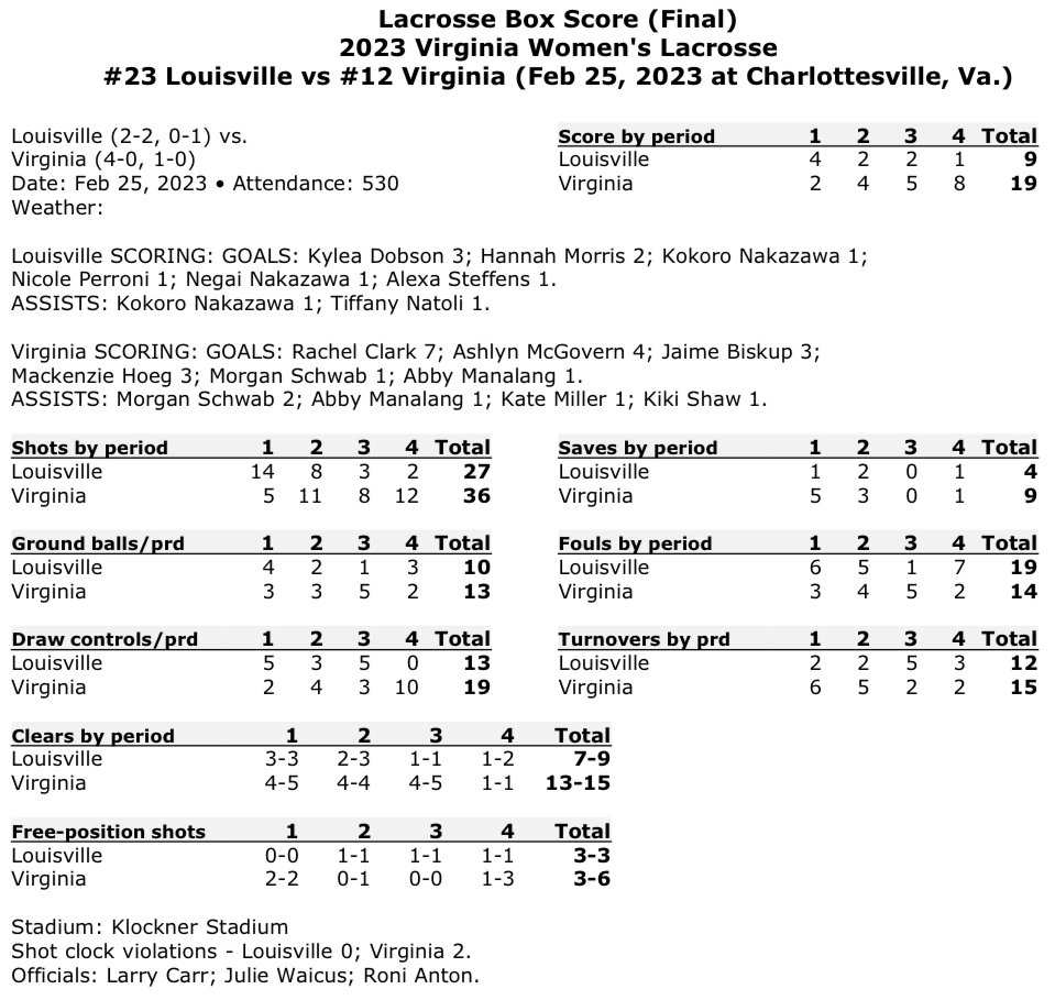 Louisville (2-2, 0-1) cut it to 10-8 before another 4-0 run for UVA opened it up to a 14-8 lead. Clark had three of the four goals. UVA’s 5-0 run to close the game included goals by sophomore Abby Manalang, Clark, junior Morgan Schwab, Biskup and McGovern.
