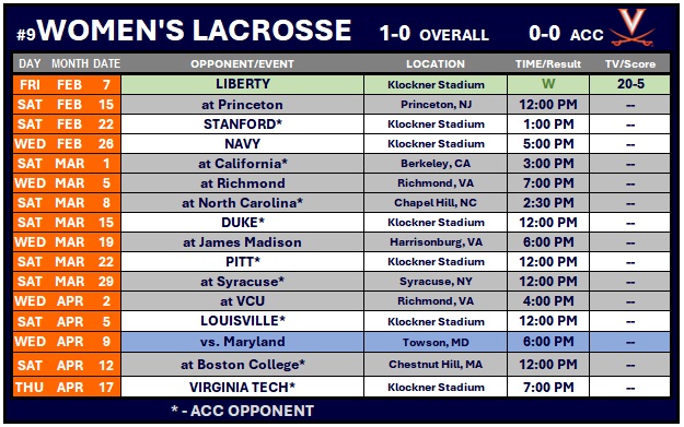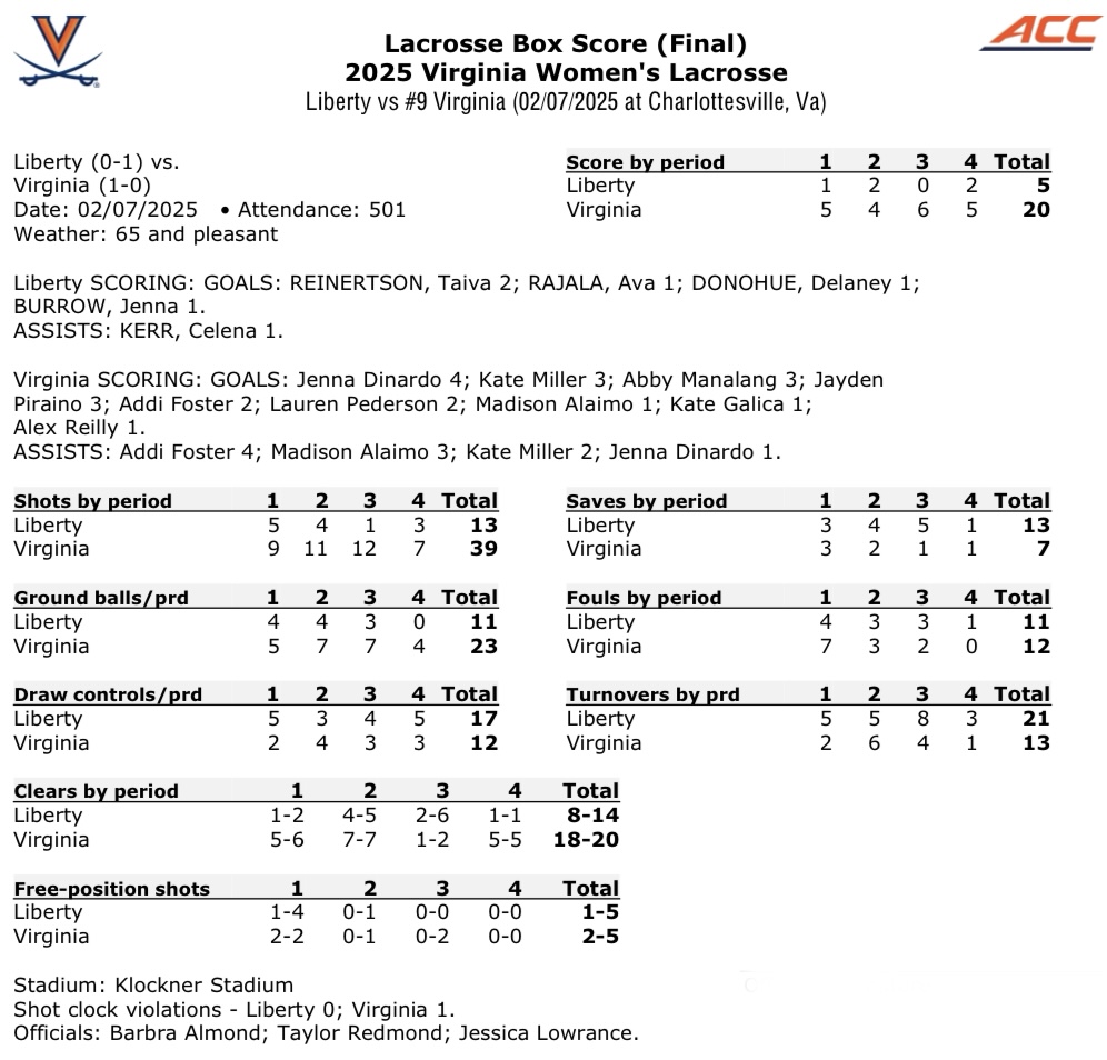 The Virginia women’s lacrosse team opened the 2025 season with a 20-5 victory against Liberty on Friday at Klöckner Stadium.