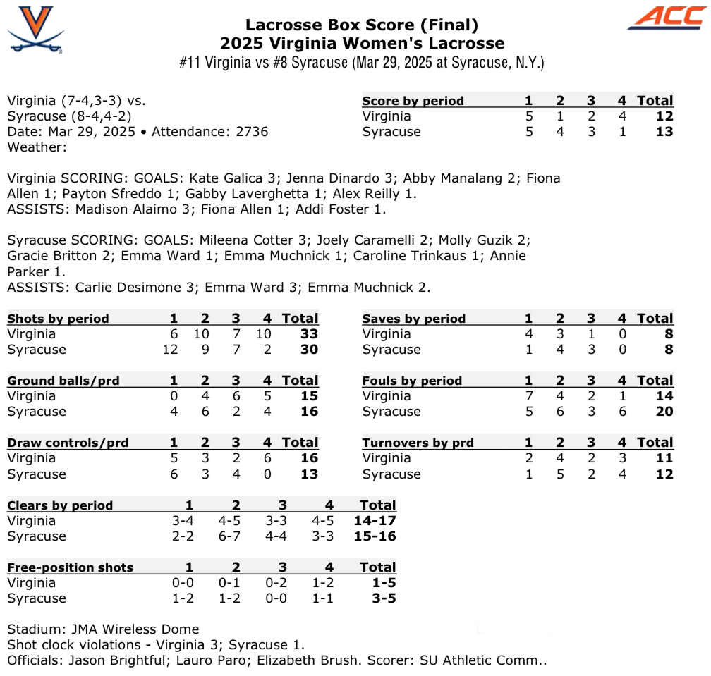 The Cavaliers (7-4, 3-3 ACC) trailed by four goals to start the fourth quarter but tied it 12-12 on a goal with 6:30 remaining. Syracuse scored with 2:57 left in the game and held on for the win.