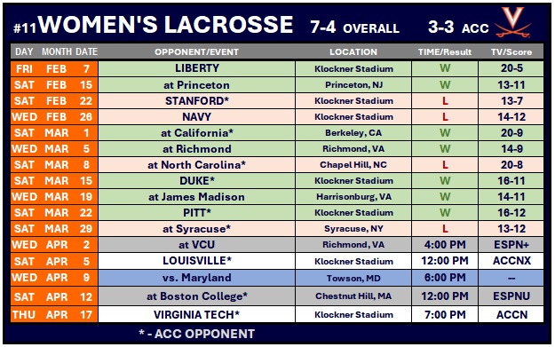 Virginia plays a midweek game at VCU on Wednesday. The Cavaliers return home to host Louisville on Saturday for Senior Day.