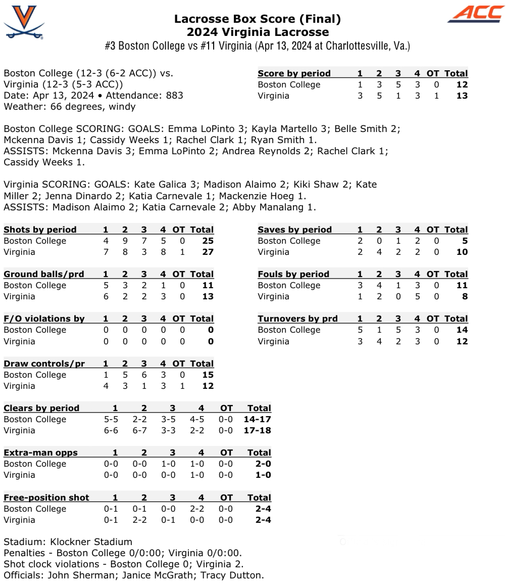 • The Cavaliers won the ground ball battle scooping up 13 to BC’s 11