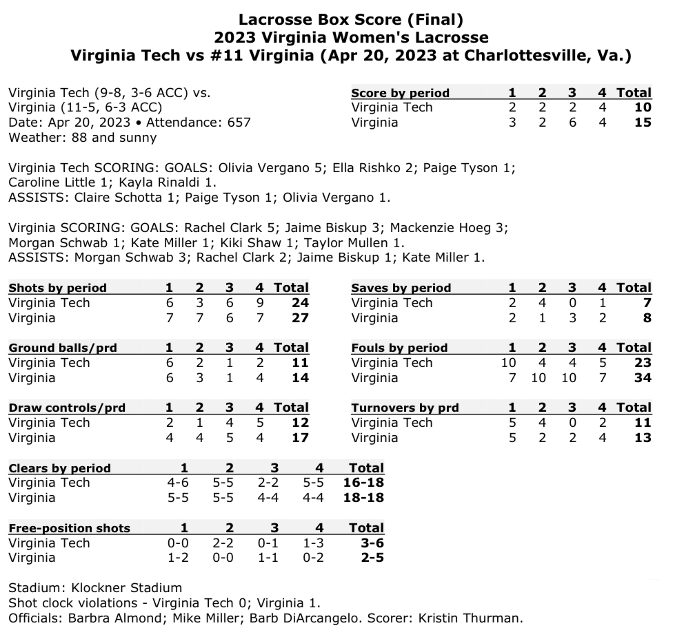 - Tech (9-8, 3-6) scored back-to-back goals to make it 11-8 but UVA responded when senior Kiki Shaw ripped a shot from just inside the 8-meter and Clark won her 1v1 for her fourth of the game.