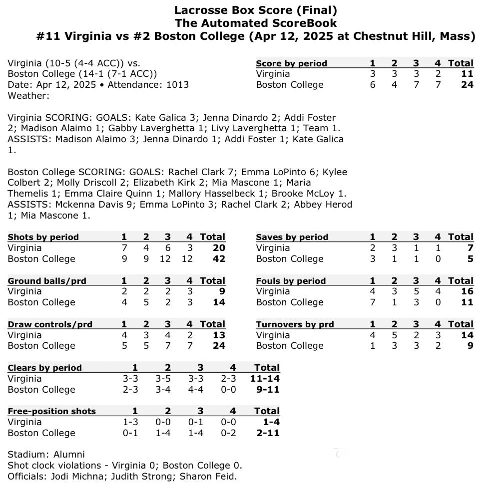 The No. 11 Virginia women’s lacrosse team suffered a 24-11 loss against No. 2 Boston College on Saturday at Alumni Stadium in Chestnut Hill, Mass.