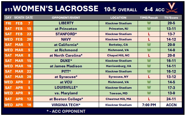 Virginia (10-5, 4-4 ACC) trailed 6-1 with 3:51 remaining in the first quarter but scored twice before the end of the period to cut the deficit to 6-3. The Eagles scored in the opening 30 seconds of the second quarter, but the Cavaliers strung together three straight goals, one apiece from freshman Gabby LaVerghetta and sophomores Addi Foster and Jenna DiNardo, to make it a 7-6 game.