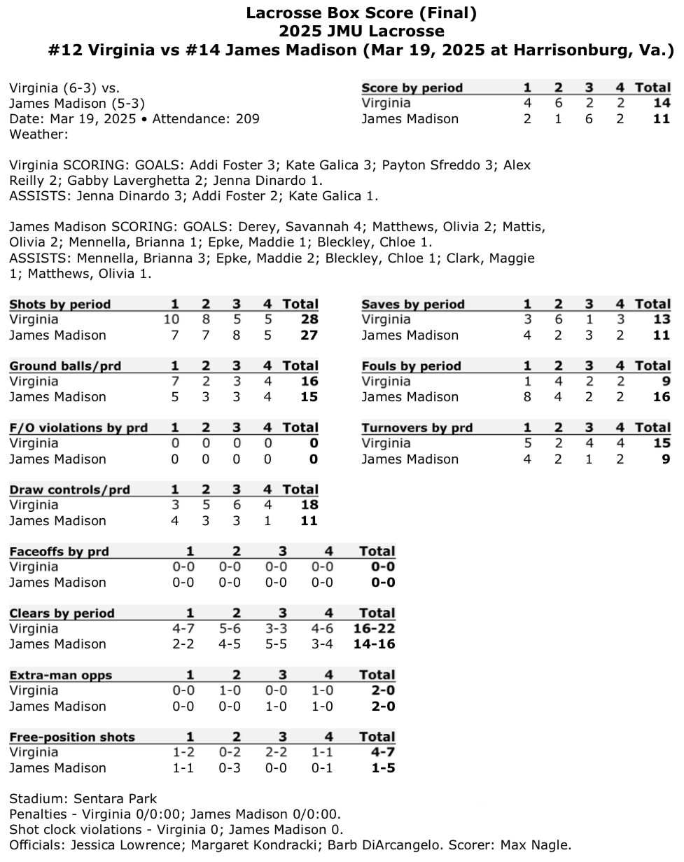 JMU scored the opening goal of the fourth period to pull within two for the first time since the end of the first quarter. However, Foster delivered a pair of goals in the final seven minutes to ice the victory for Virginia.