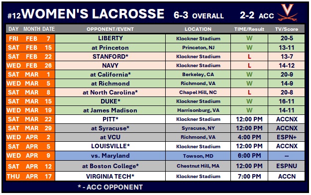 Virginia dominated the second quarter ,scoring the first five goals of the period to extend its scoring run to six straight – its longest of the game. After scoring once in the first, Sfreddo notched a pair of goals in the second to secure the first hat trick of her collegiate career.  Josephson ended the first half with nine saves.