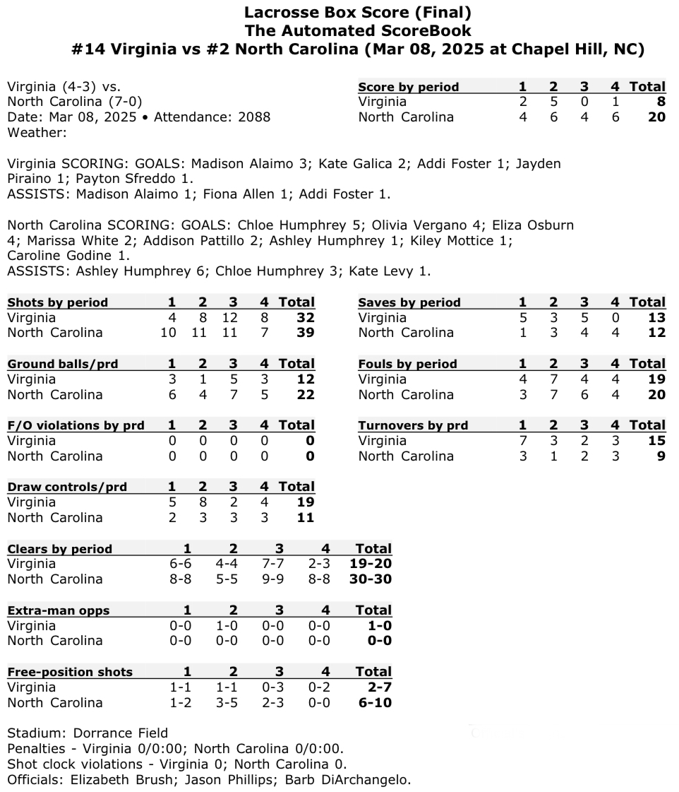 The No. 14 Virginia women’s lacrosse team suffered a 20-8 defeat at No. 2 North Carolina on Saturday at Dorrance Field in Chapel Hill.