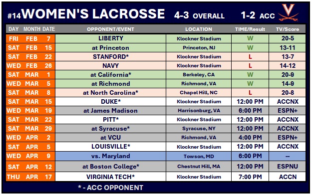 Virginia is back home next Saturday (March 15), hosting No. 18 Duke at noon. This is UVA’s Alumni Game, as well as the Headstrong Game.