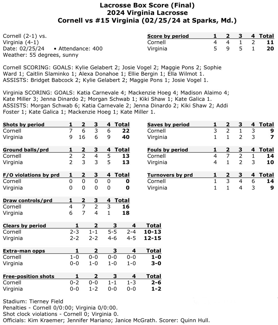 - Virginia outscored Cornell 5-1 in the third quarter and has outscored its 2024 opponents by a margin of 21-6