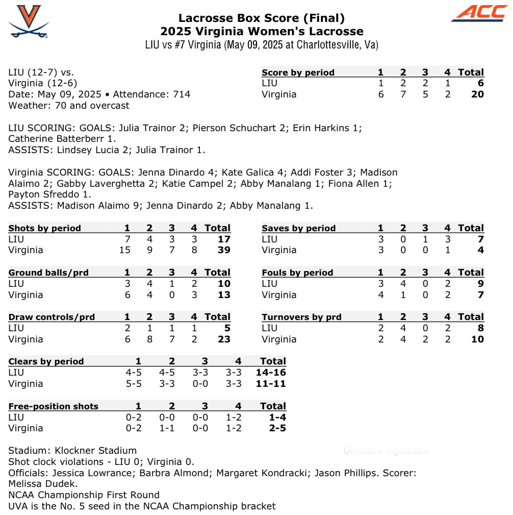 The No. 5 seed Virginia women’s lacrosse team logged a 20-6 victory against LIU in a first-round game of the NCAA Division I Championship at Klöckner Stadium.