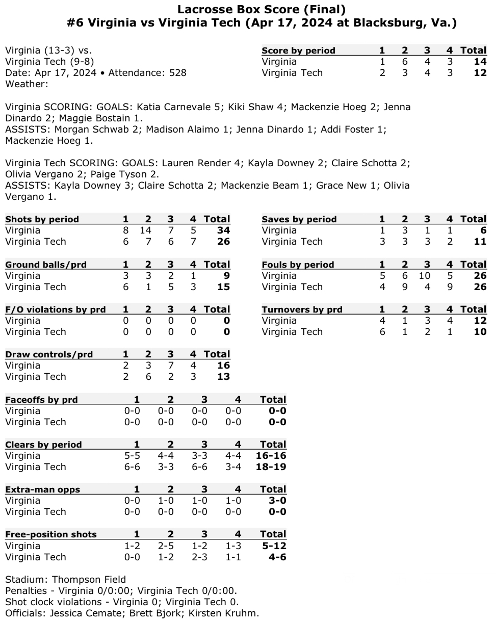 Women’s Lacrosse: No. 6 UVA closes out regular season with 14-12 win at Virginia Tech