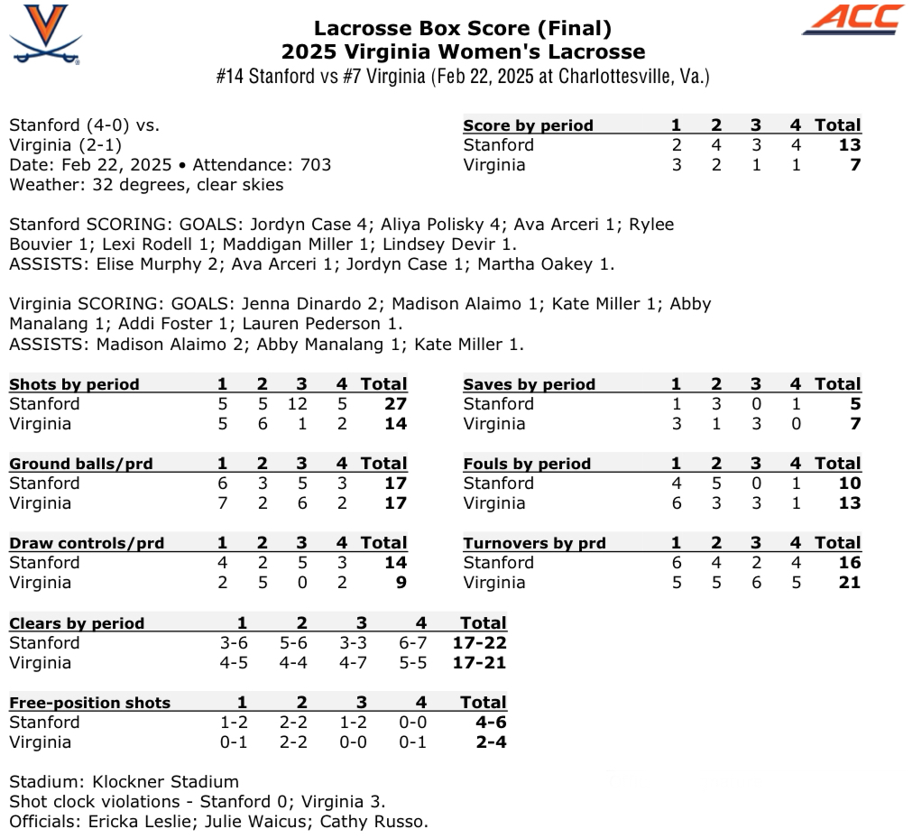 Stanford (4-0, 1-0) extended its scoring run to six consecutive goals netting the first four of the second quarter to take a 6-3 lead. Foster and Manalang each converted a pair of free-position opportunities in the closing moments of the half as Virginia went into the locker room trailing by a score of 6-5.