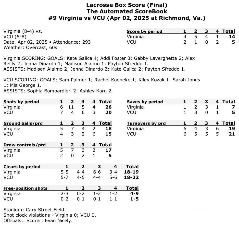 The No. 9 Virginia women’s lacrosse team picked up a 14-5 win at VCU on Wednesday at Cary Street Field in Richmond.