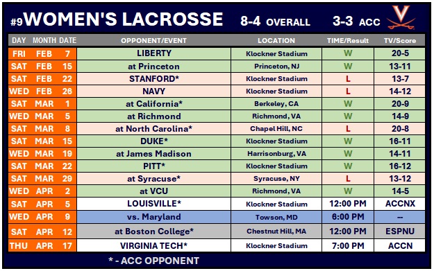 Sophomore midfielder Kate Galica led the Cavaliers with four goals and two assists. She also had 10 draw controls. Sophomore attacker Addi Foster had a hat trick.
