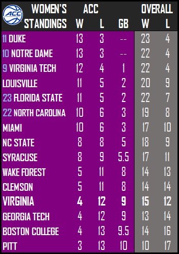 Virginia closes out the regular season at Miami on Sunday with a noon game that will be broadcast on the ACC Network. The 2023 ACC Women’s Basketball Tournament occurs March 1-5 at the Greensboro Coliseum in Greensboro, N.C. Seeding for the tournament will be announced Sunday evening.