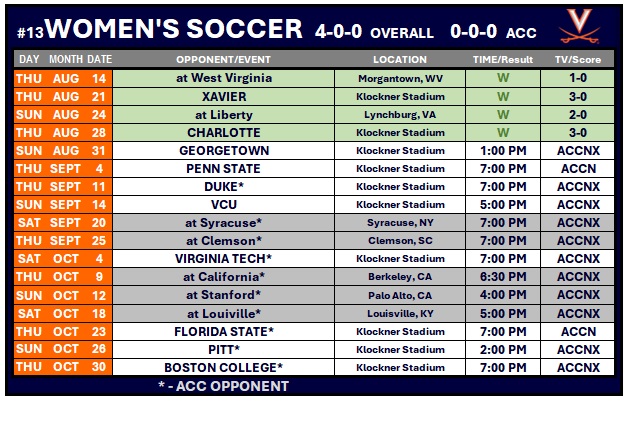 The Cavaliers (4-0-0) had the run of play through much of the first half, but were unable to convert early until a corner kick in the 39th minute broke the stalemate. Linda Mittermair served the ball from the right corner toward the far post where it was headed down and in by Kiki Maki from just outside the six.