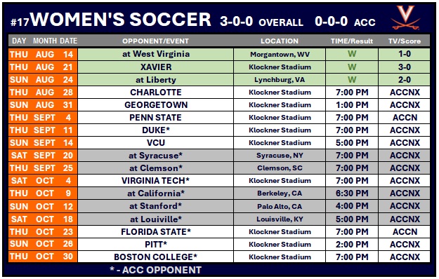Virginia returns home to host Charlotte on Thursday with a 7 p.m. kick at Klöckner Stadium. The game against the 49ers begins a five-game home stand for the Cavaliers.