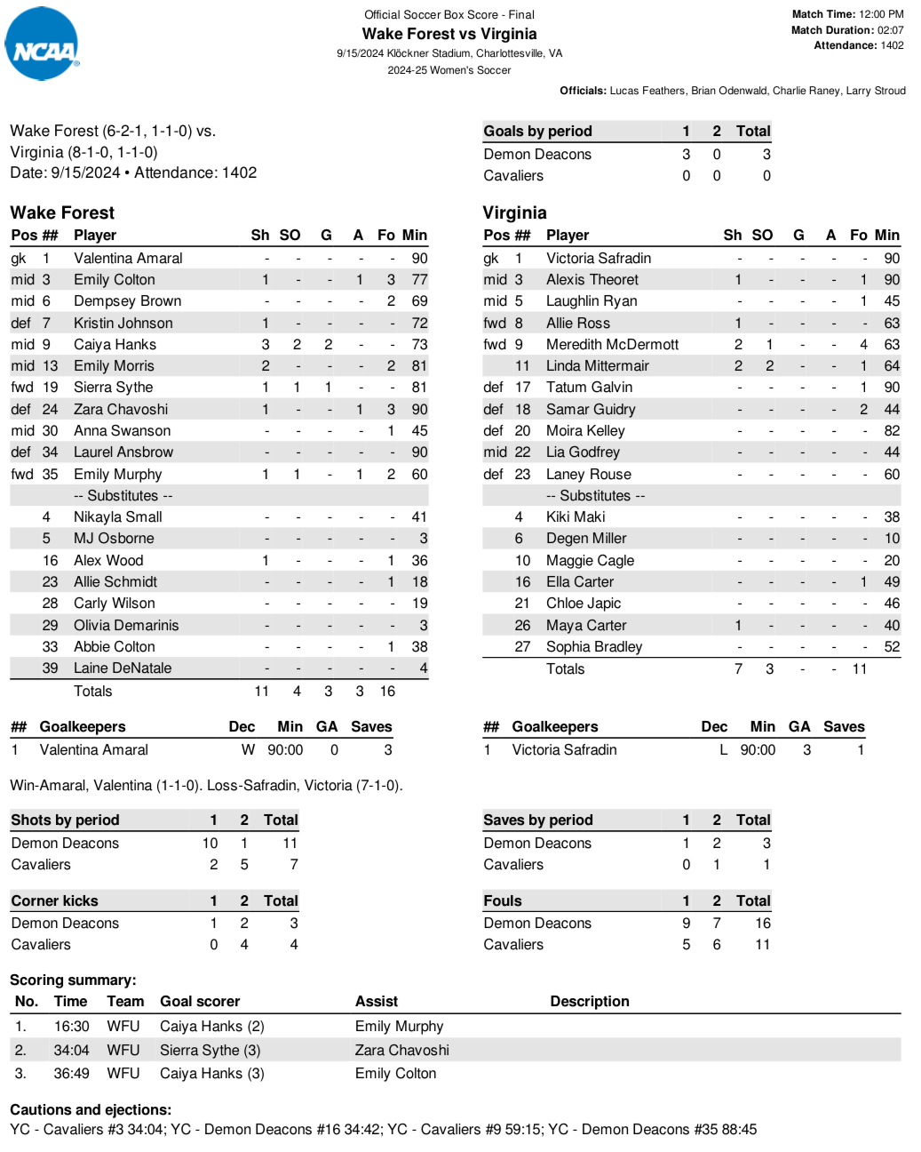 Wake Forest doubled the lead on the Cavaliers (8-1-0, 1-1-0) off a free kick that was awarded after players got tangled up near the center circle in the 35th minute. Zara Chavosi sent a ball in that was initially deflected by a Virginia defender in the air, but the ball fell to Sierra Sythe near the six and she finished for the score.