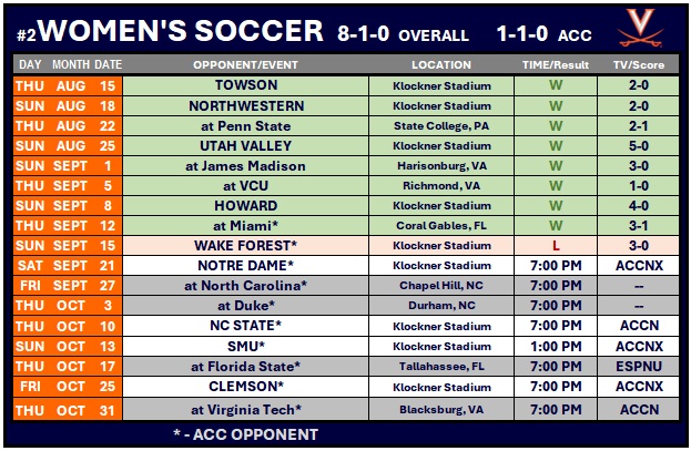 Virginia will continue to play at home next weekend with a single game as the Cavaliers host No. 13 Notre Dame on Saturday. Kick is set for 7 p.m. at Klöckner Stadium and it will be the program’s Alumni Weekend and Pride Game.