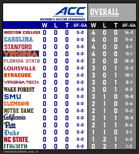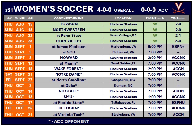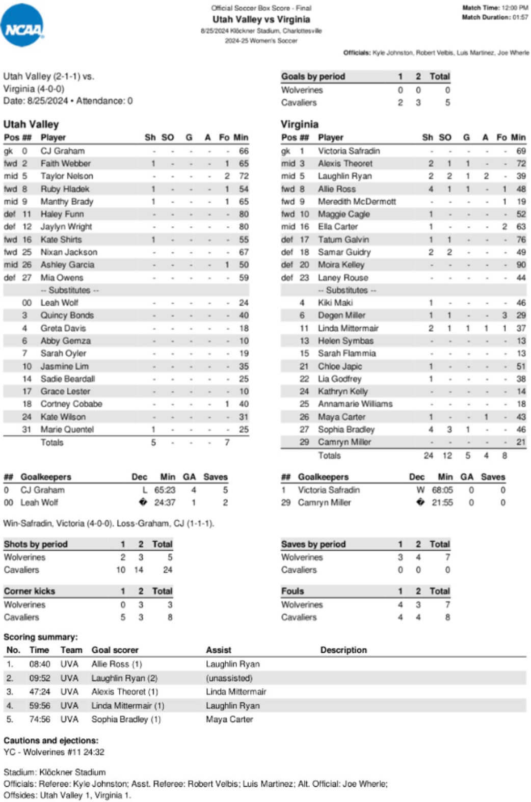 The Cavaliers (4-0-0) got on the board in the ninth minute as Utah Valley (2-1-1) was unable to clear the ball and Virginia reset the offense after regaining the ball at the penalty arc. Ella Carter played the ball out wide to the right to Laughlin Ryan who drove to the endline and served a cross in toward the penalty spot. Allie Ross headed it in back toward the near post for the score.