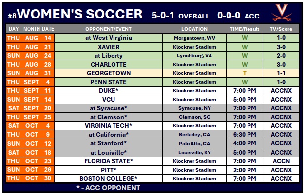 Virginia continues to play at home next week with a contest against No. 3 Duke on Thursday (Sept. 11) and then a showdown with VCU on Sunday (Sept. 14).
