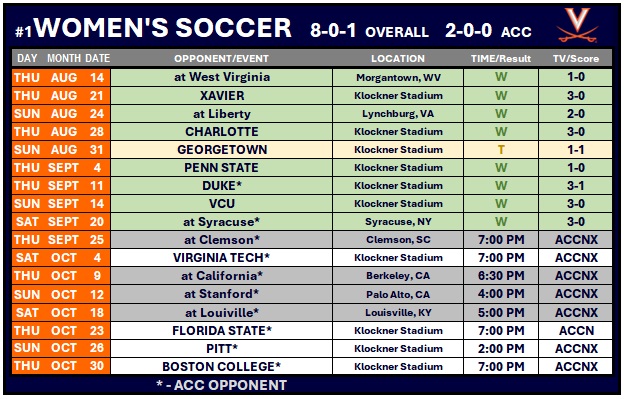 - With the win, Virginia improved to 8-0-1 against Syracuse and 4-0-0 in games at SU Soccer Stadium.