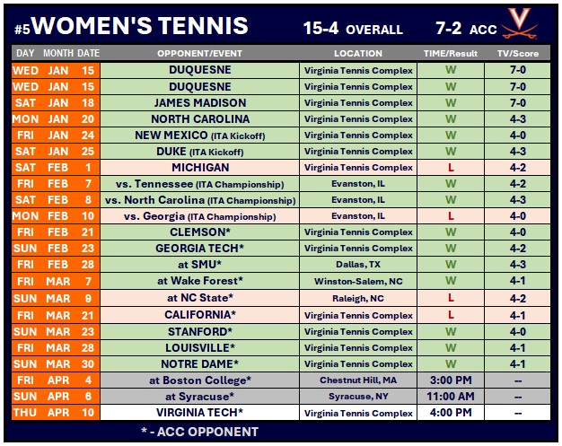 The Cavaliers (15-4, 7-2 ACC) rallied after losing the doubles point, winning four singles matches to come away with the victory against the Irish (15-4, 5-3).