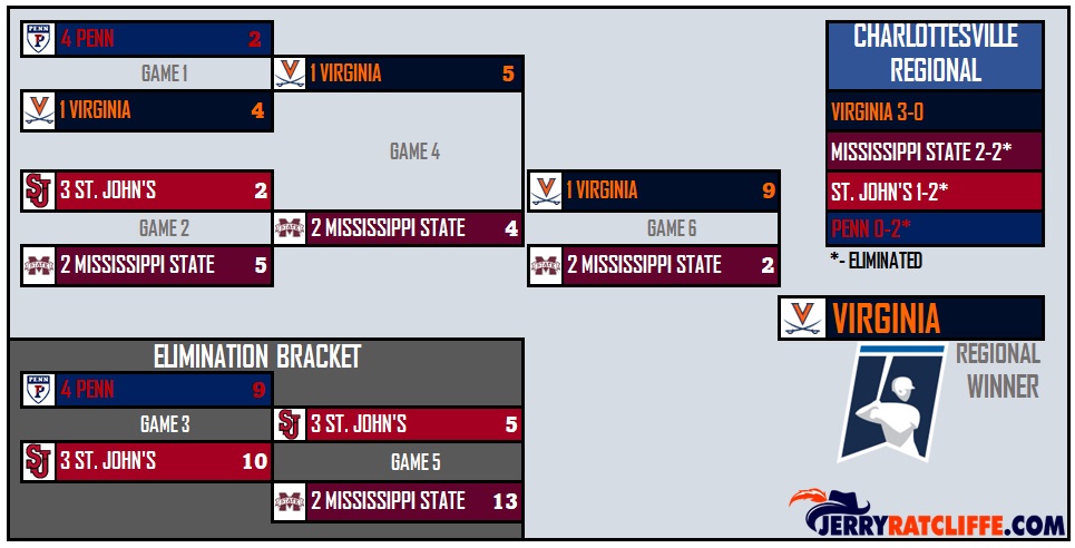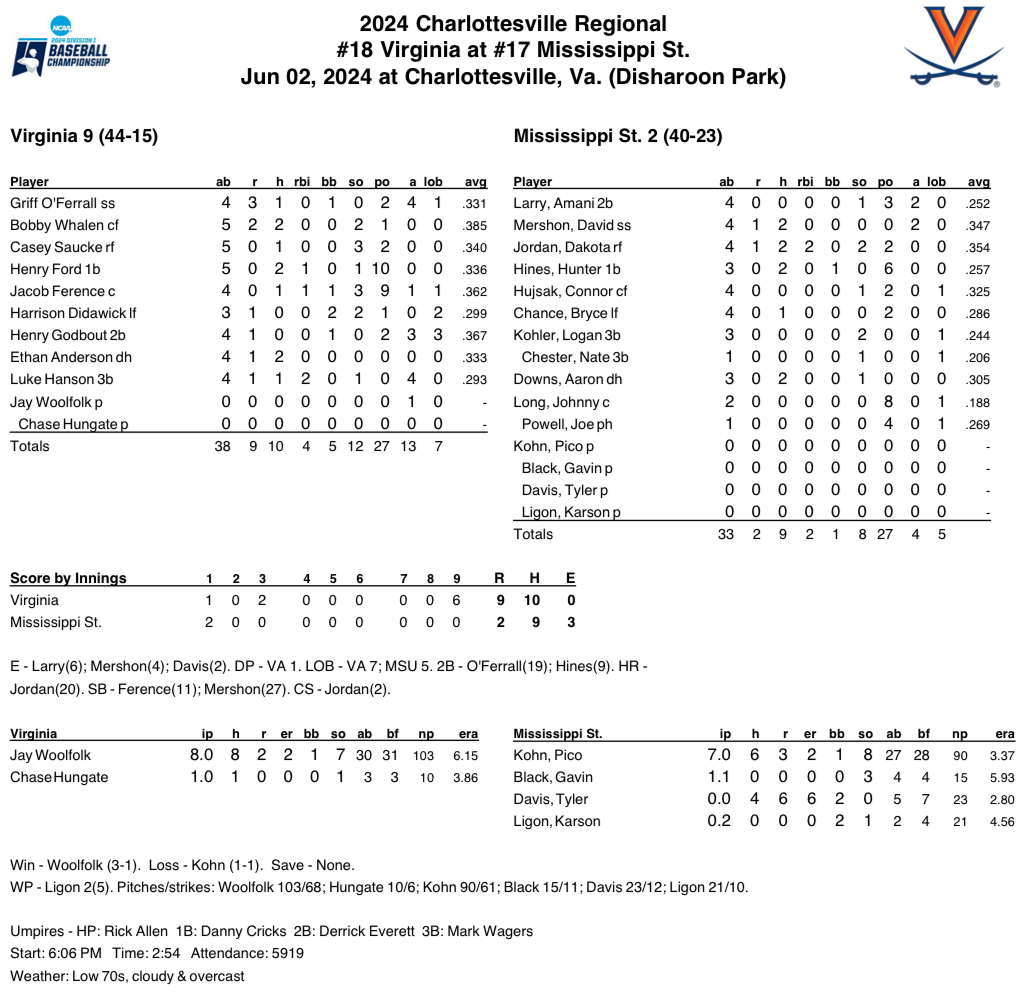 The tit-for-tat erupted in the top of the ninth with Virginia blowing the game wide open, as Mississippi State became completely unglued. UVA scored six runs with hitting only one ball out of the infield.
