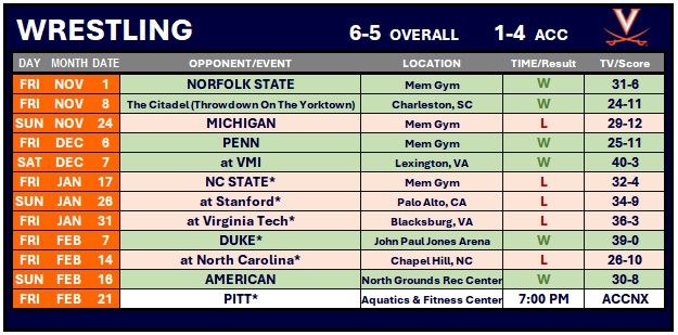 Virginia continues to wrestle at home next weekend with No. 18 Pittsburgh coming to town on Friday. The dual is set to begin at 7 p.m. at the Aquatics & Fitness Center.